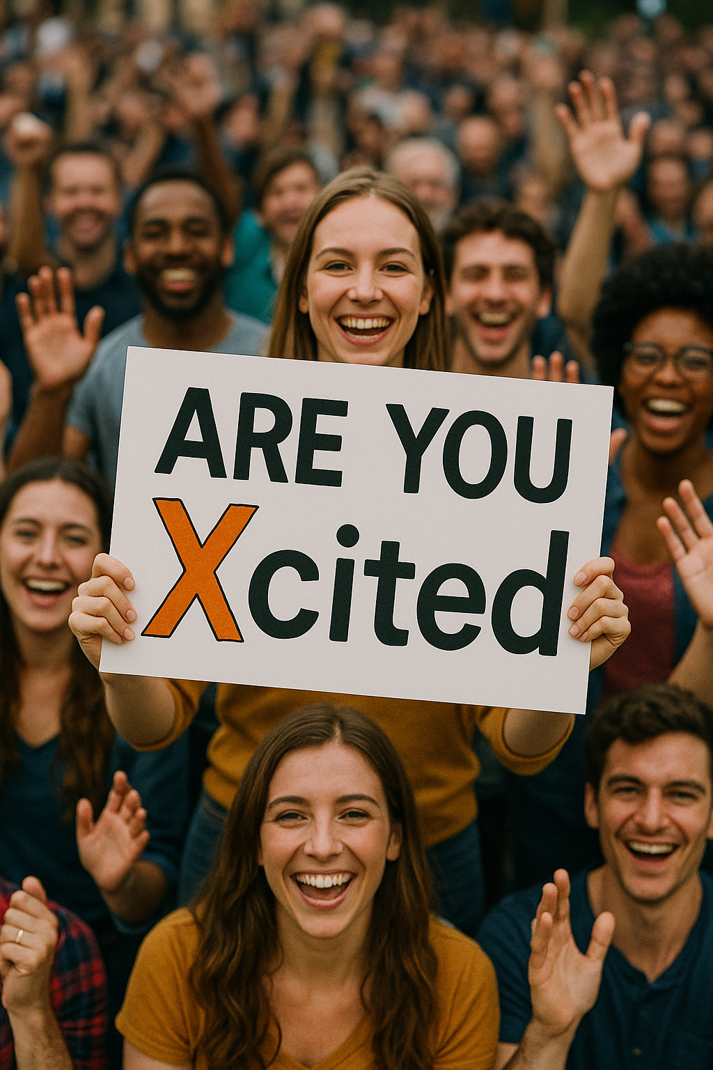 A group of diverse happy people at a rally or protest, with a woman in the center holding a sign that reads 'Are you Xcited', smiling at the camera.